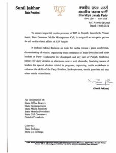 “To ensure impactul media presence of BJP in Punjab, henceforth, Vineet Joshi, State Convenor Media Management Cell, is assigned as one-point person for all media related affairs of BJP Punjab,” read the official letter.