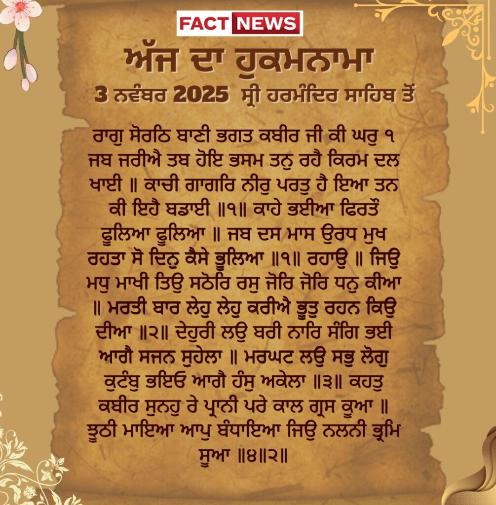 ਅੱਜ ਦਾ ਹੁਕਮਨਾਮਾ, ਸ੍ਰੀ ਦਰਬਾਰ ਸਾਹਿਬ, ਅੰਮ੍ਰਿਤਸਰ (3 ਨਵੰਬਰ 2025)