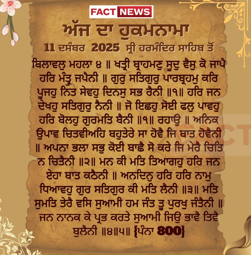 ਅੱਜ ਦਾ ਹੁਕਮਨਾਮਾ, ਸ੍ਰੀ ਦਰਬਾਰ ਸਾਹਿਬ, ਅੰਮ੍ਰਿਤਸਰ (11 ਦਸੰਬਰ 2025)