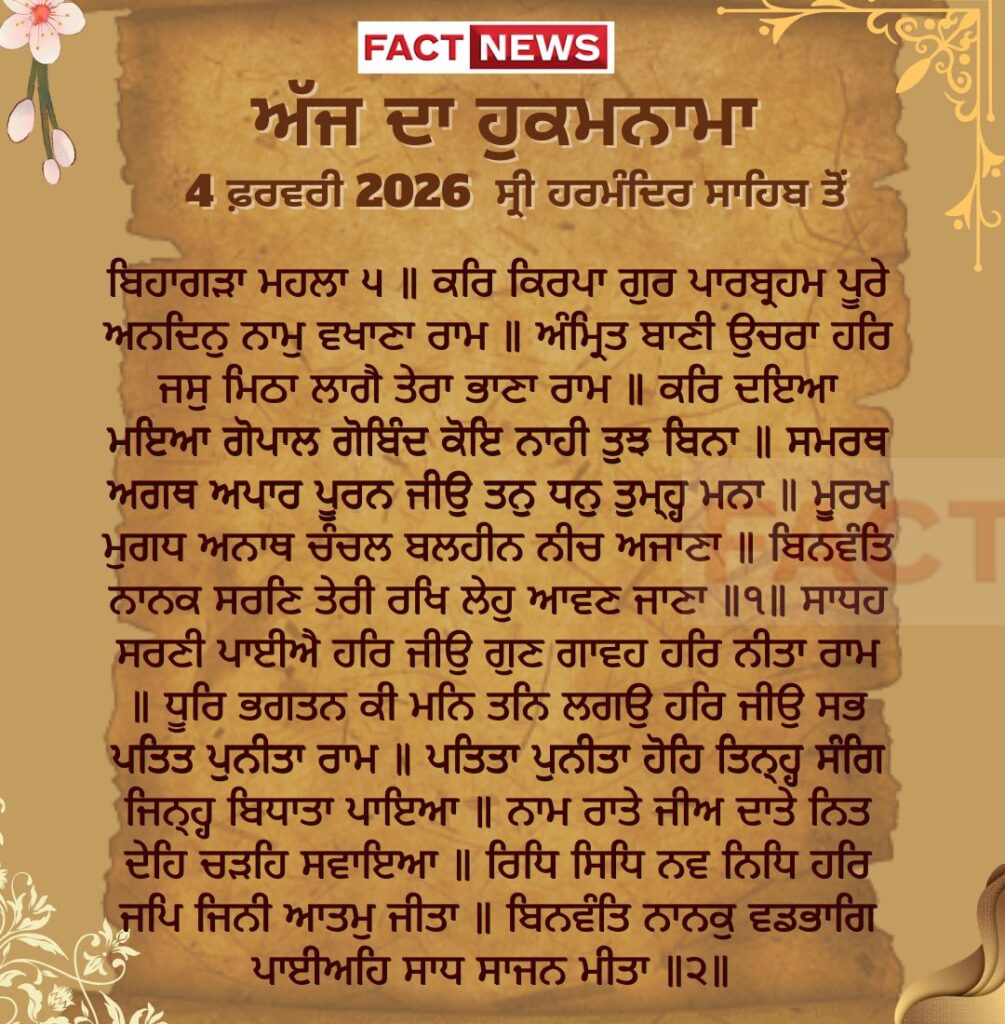 ਅੱਜ ਦਾ ਹੁਕਮਨਾਮਾ, ਸ੍ਰੀ ਦਰਬਾਰ ਸਾਹਿਬ, ਅੰਮ੍ਰਿਤਸਰ (4 ਫ਼ਰਵਰੀ 2026)